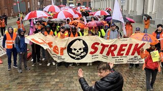 Am Donnerstag, dem 23. Oktober haben Beschäftigte des Essenlieferdienstes Lieferando (Takeaway Express B.V. & Co. KG) gestreikt. Mit eine lebendigen Streikdemonstration zur Firmenzentrale setzten sie ein klares Zeichen für gute Löhne und sichere Jobs und gegen die unsoziale Politik des Unternehmens. Lieferando will bundesweit etwa 2.000 Jobs auslagern. Beschäftigte drohen in die Scheinselbständigkeit abgeschoben zu werden oder sich als Angestellte von Subunternehmen wiederzufinden, sogenannte Schattenflotten, die inzwischen für ihre illegalen Praktiken berüchtigt sind. Mit dem Streik will die Gewerkschaft als Gegenmodell gegen diese Unternehmenspolitik einen Tarifvertrag durchsetzen.