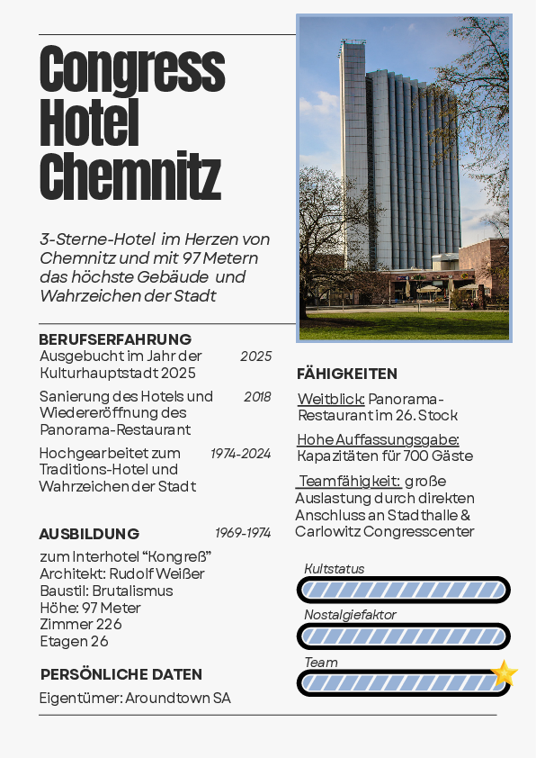 Der „Lebenslauf” wiederum gibt Aufschluss über den Werdegang des Hotels: Von der „Ausbildung” („Bauzeit 1969 bis 1974“) über die „Arbeitserfahrung” („volle Auslastung im Jahr der Kulturhauptstadt 2025“) bis hin zu „Fähigkeiten” wie dem Panoramablick aus dem Restaurant im 26. Stock.